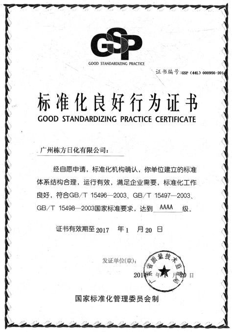 2017年4月20日,廣州市質(zhì)量監(jiān)督檢測研究院與標(biāo)準(zhǔn)化研究院組織6人評審組,對廣州棟方生物科技股份有限公司進行了“標(biāo)準(zhǔn)化良好行為企業(yè)”首次復(fù)審。經(jīng)一系列嚴(yán)苛的資料審核、現(xiàn)場確認(rèn)等程序,棟方股份以總計465的高分(總分500)優(yōu)勢,順利通過專家評審組的一致確認(rèn),繼續(xù)保持“國家AAAA級標(biāo)準(zhǔn)化良好行為企業(yè)”的榮譽稱號。