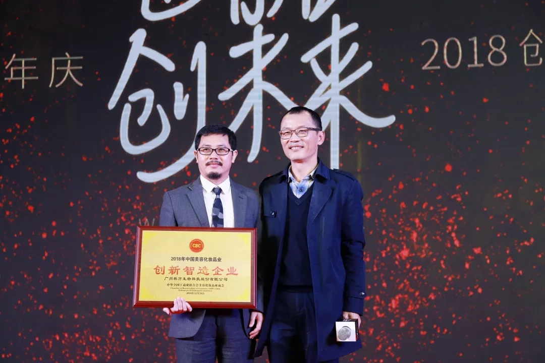 隨后,青島金王總經(jīng)理唐風(fēng)杰先生,中國美妝總經(jīng)理桂紹元先生、中華全國工商聯(lián)合會(huì)美容化妝品業(yè)商會(huì)蔡永忠副會(huì)長先后上臺(tái)致辭,對棟方股份集團(tuán)近幾年的卓著成就給予高度肯定,對行業(yè)發(fā)展發(fā)表了頗有見地的分享。蔡永忠副會(huì)長代表中華全國工商聯(lián)合會(huì)美容化妝品業(yè)商會(huì)給棟方股份集團(tuán)20周年帶來了一份驚喜的生日禮物,為棟方股份頒發(fā)了“創(chuàng)新智造企業(yè)”大獎(jiǎng),回顧棟方股份2018年的累累碩果,這一榮譽(yù),實(shí)至名歸。